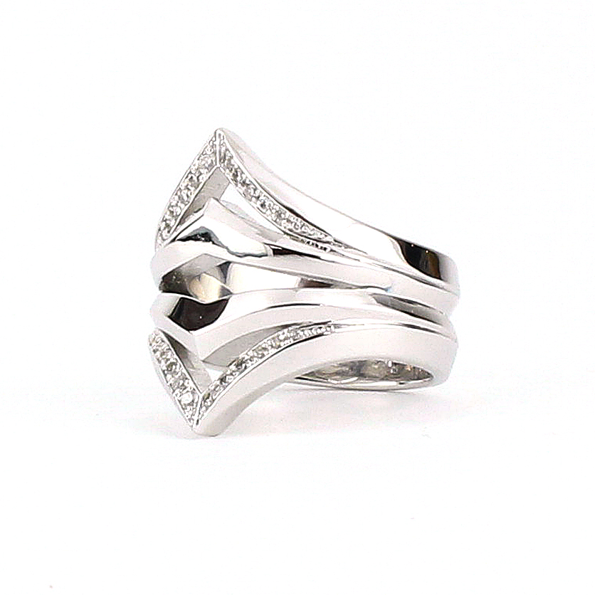 ◇キングリモが得意とする立体的なプロダクトデザイン。エッジが立つ面とシャープなフォルムを融合した造形美がラグジュアリーなリングに仕上がっています。